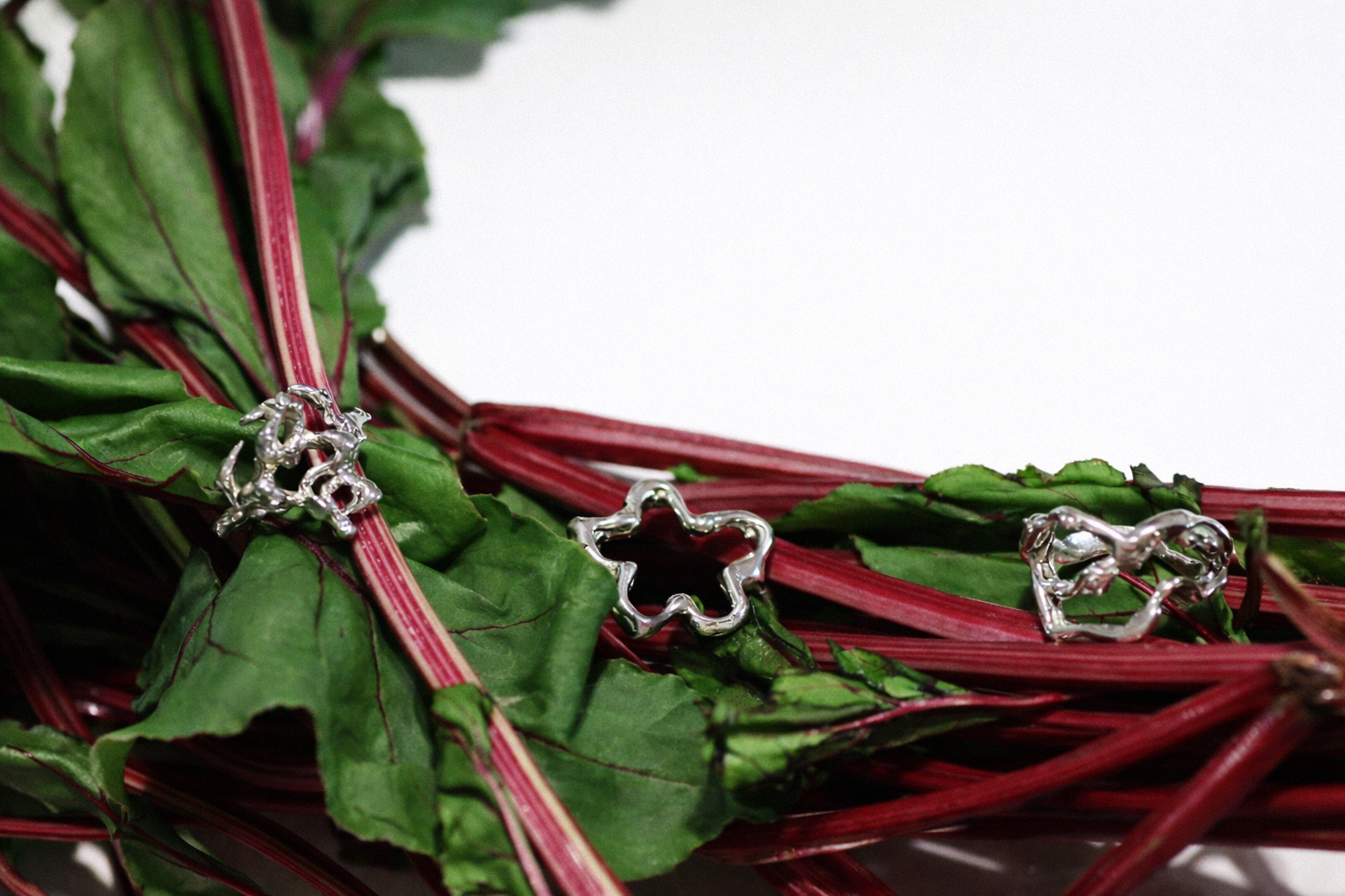 A fluid silver outline forms an abstract flower, open, weightless, and bold. Bloom feels graphic and unapologetically alive.