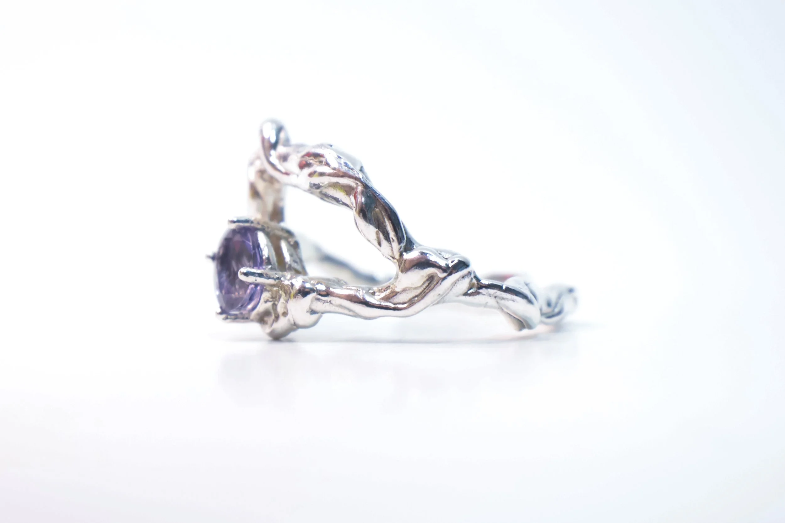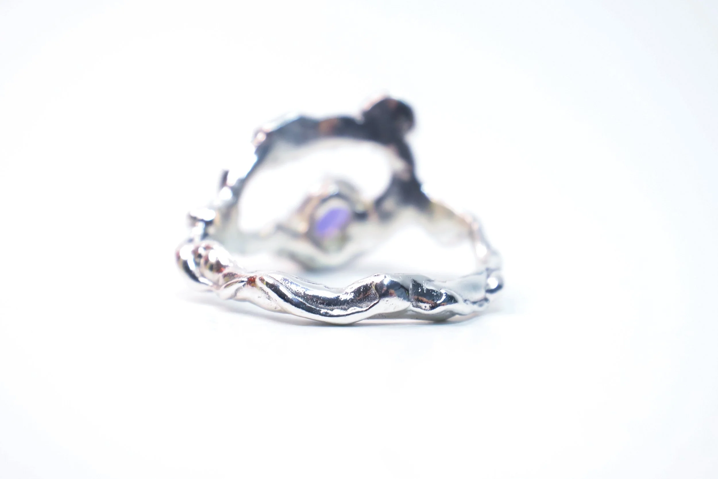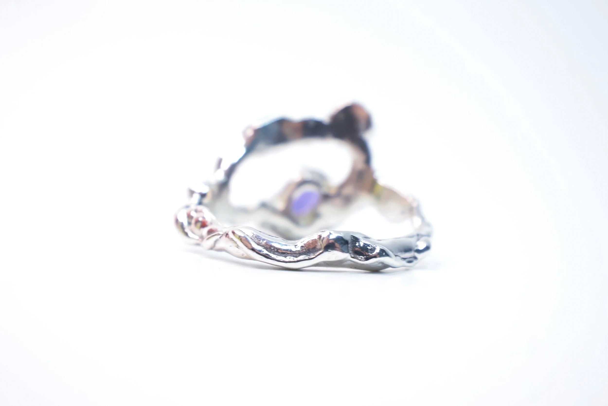 A rich burst of color meets handcrafted elegance in this Sterling Silver Ring featuring a vibrant Rhodolite gemstone. Set in a simple yet refined design, the deep pinkish-red stone adds a warm, radiant touch to the cool tone of silver. Carefully shaped by hand, this piece carries both timeless beauty and a distinctive artisan character—perfect for adding a bold note to your everyday or evening look.